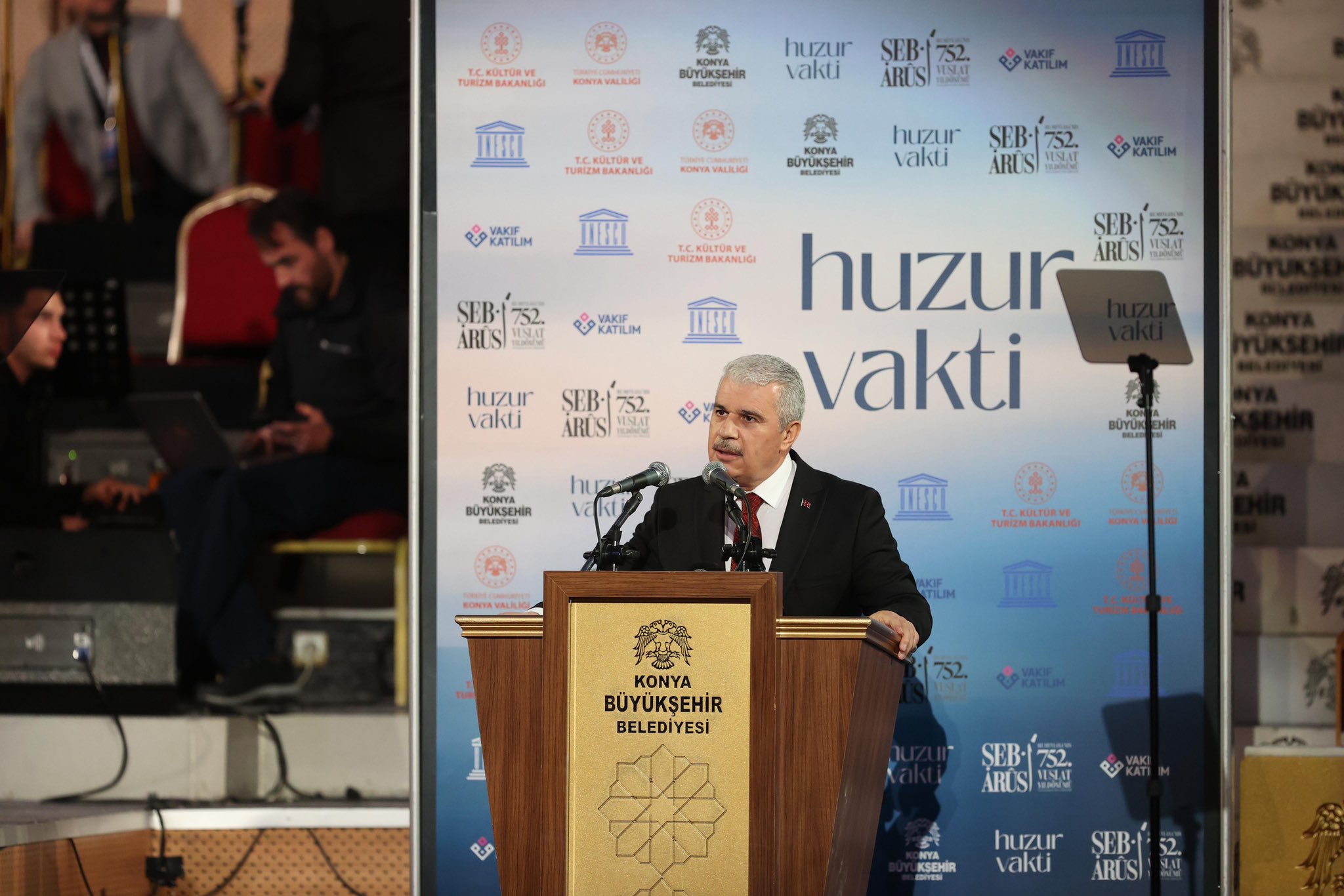 Şeb-i Arûs programında bir konuşma yapan Kültür ve Turizm Bakanı Mehmet Nuri Ersoy, Mevlâna’nın evrensel mesajlarının insanlık için anlam taşıdığına vurgu yaptı. Ersoy, Mevlâna’nın düşüncelerinin çok farklı inanca ve yaş grubuna sahip bireylerin ruhsal yolculuklarına rehberlik etmeye devam ettiğini ifade etti. Mesnevi’nin tasavvuf edebiyatındaki yeri hakkında bilgi veren Bakan, bu eserinin Allah’a ulaşma arzusunda olan herkes için bir rehber niteliği taşıdığını belirtti.