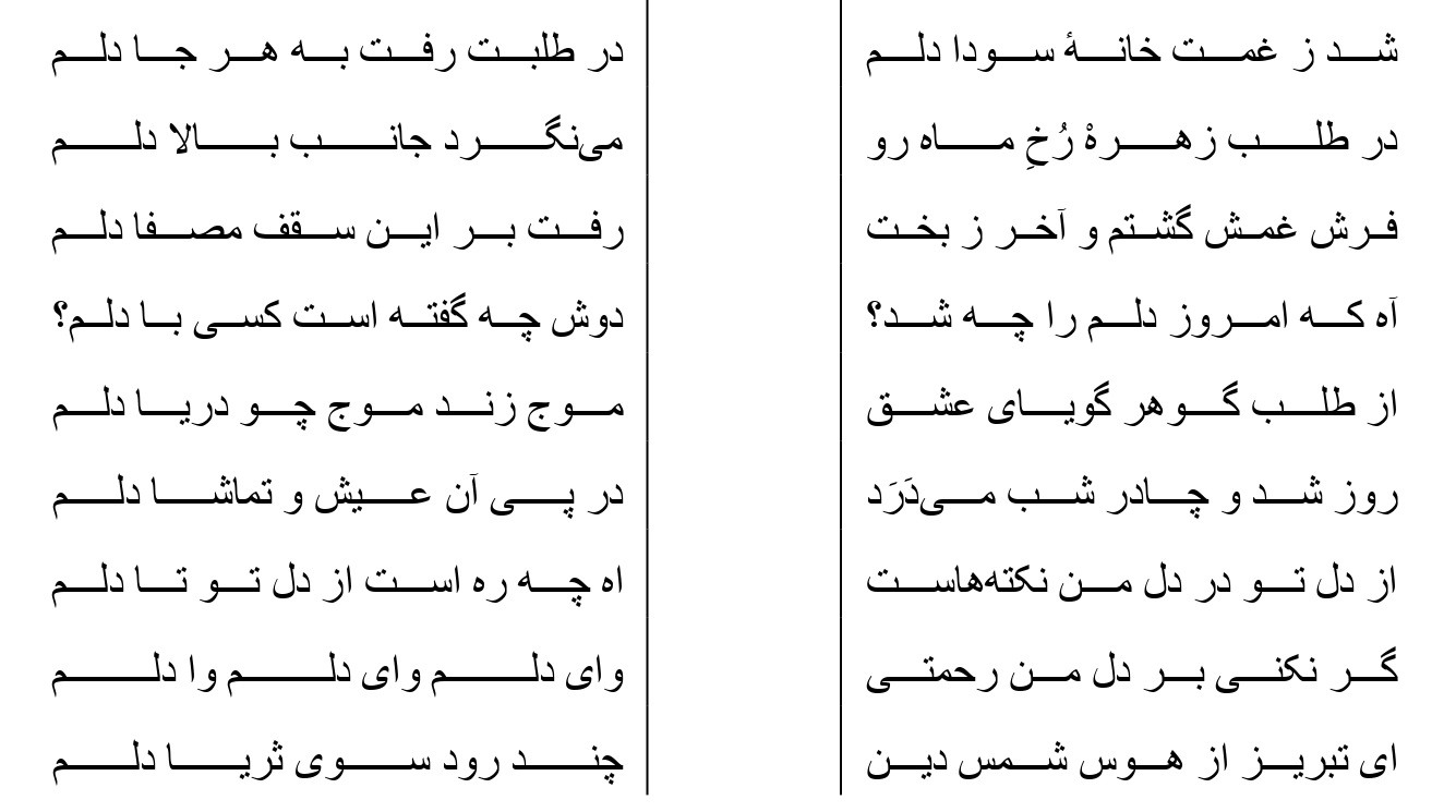 24 Mevlânâ Celâleddîn Muhammed-i Mevlevî-i Rûmî, Külliyât-ı Dîvân-ı Şems-i Tebrîzî, nşr. Bedîüzzamân Fürûzanfer (Tahran, Sipihr Matbaası, 1363), 667. Derdinle sevda yurdu oldu gönlüm; seni araya araya her yana gitti gönlüm. / Zühre yanaklı, ay yüzlü sevgiliyi istiyor; göklere bakınıp duruyor gönlüm. / Derdine döşeme kesilmiştim; baht yardım etti de sonunda şu aparı tavanın üstüne çıktı gönlüm. / Ah, bugün neler oldu gönlüme; dün birisi neler söyledi gönlüme? / O söyler aşk incisinin isteğiyle, deniz gibi dalgalandıkça dalgalanıyor gönlüm. / Gündüz geldi, gecenin çarşafını yırttı; bundan sonra da neşelenecek, seyre dalacak gönlüm. / Gönlünden gönlüme ne ince anlamlar ne gizli işaretler geliyor; ah, gönlünden gönlümenasıl bir yol var. / Gönlüme bir acımazsan yok mu; vay gönlüm, vay gönlüm, vay gönlüm. / Ey Tebriz, Şemseddin’in hevesiyle niceye bir Ülker yıldızına gidecek gönlüm? Bkz. Mevlânâ, Dîvân-ı Kebîr, çev. Abdülbâki Gölpınarlı (İstanbul: Türkiye İş Bankası Kültür Yayınları, 2007), 5/84.