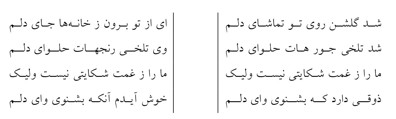 [98] Gazelin ilk mısraları fâʿilâtün/fâʿilâtün/fâʿilün vezniyle, ikinci mısraları ise bu vezne bir tef’ile eklenerek fâʿilâtün/fâʿilâtün/fâʿilâtün/fâʿilün vezniyle yazılmıştır.