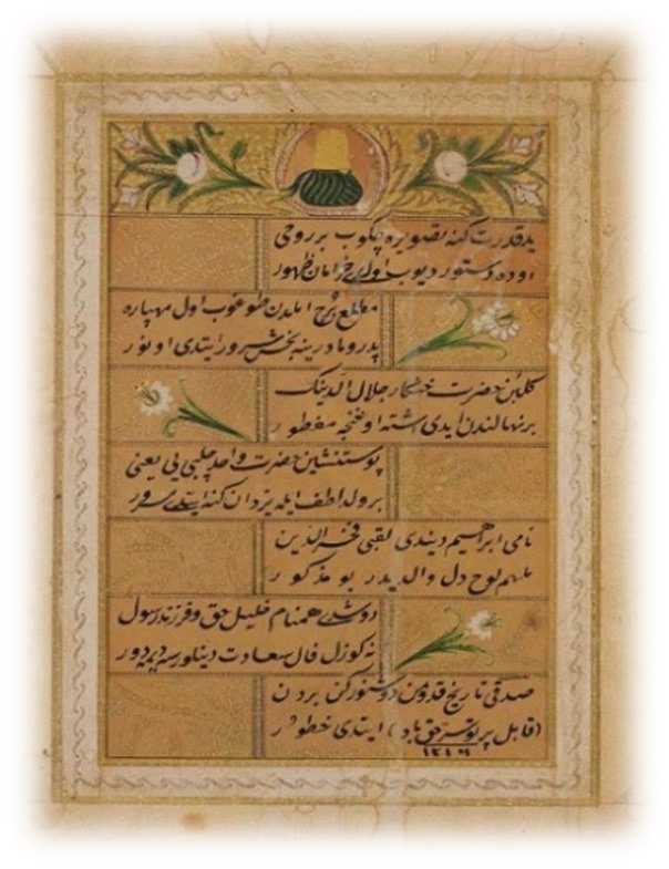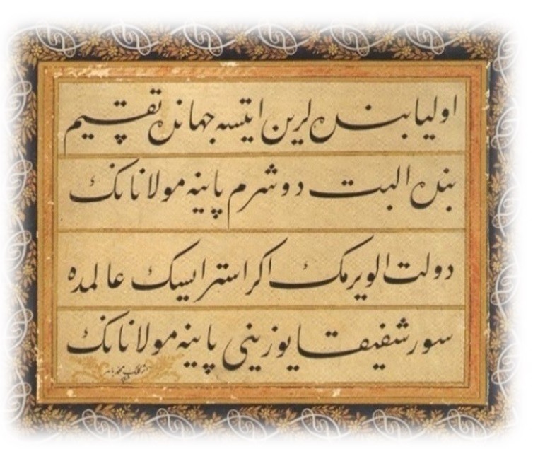 Ataullah el Mevlevî’nin Türk Vakıf Hat Sanatlan Müzesi’nde talik hat ile yazdığı 1825-1826 tarihli eserinde: