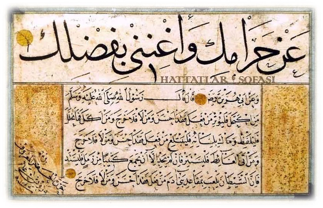 Islamic calligraphy (ḥüsn-i ḥatt) has traditionally been transmitted through the master-apprentice relationship using the meşk method. It was primarily taught in schools (mektep), madrasas, the Ottoman palace, and the private studios of master calligraphers. In addition to these formal institu- tions, Sufi lodges (tekke and zāwiya) played a significant role in the education and practice of calligraphy, incorporating it into the spiritual training process known as seyr ü sülūk. Historically, many leading calligraphers were affiliated with Sufi orders, drawing both spiritual and artistic inspira- tion from these connections. For example, Hāfız Osman (1642–1698), a pivotal figure in Ottoman calligraphy, was associated with the Sünbüliyye branch of the Halvetiyye-Cemâliyye order. Similarly, Kazasker Mustafa İzzet (1801–1876) was linked to the Rūmiyye branch of the Qādiriyya order. Edirne, a major center for the arts, produced many calligraphers affiliated with the Gülşenî order. Among the Sufi orders, the Mevlevi tradition stands out for its profound relationship with the arts. Within Mevlevi lodges (Mevlevîhānes), initiates (muhib) were often trained in at least one form of Islamic art, including music, marbling (ebru), paper cutting (kat‘), illumination (tezhip), and calligraphy. This emphasis on artistic education stems from the teachings of Mevlānā Jalāl al-Dīn Rūmī and his son Sultan Veled, who viewed artistic expression as a form of spiritual refinement. The widespread presence of Mevlevi lodges further amplified their cultural and artistic influence.