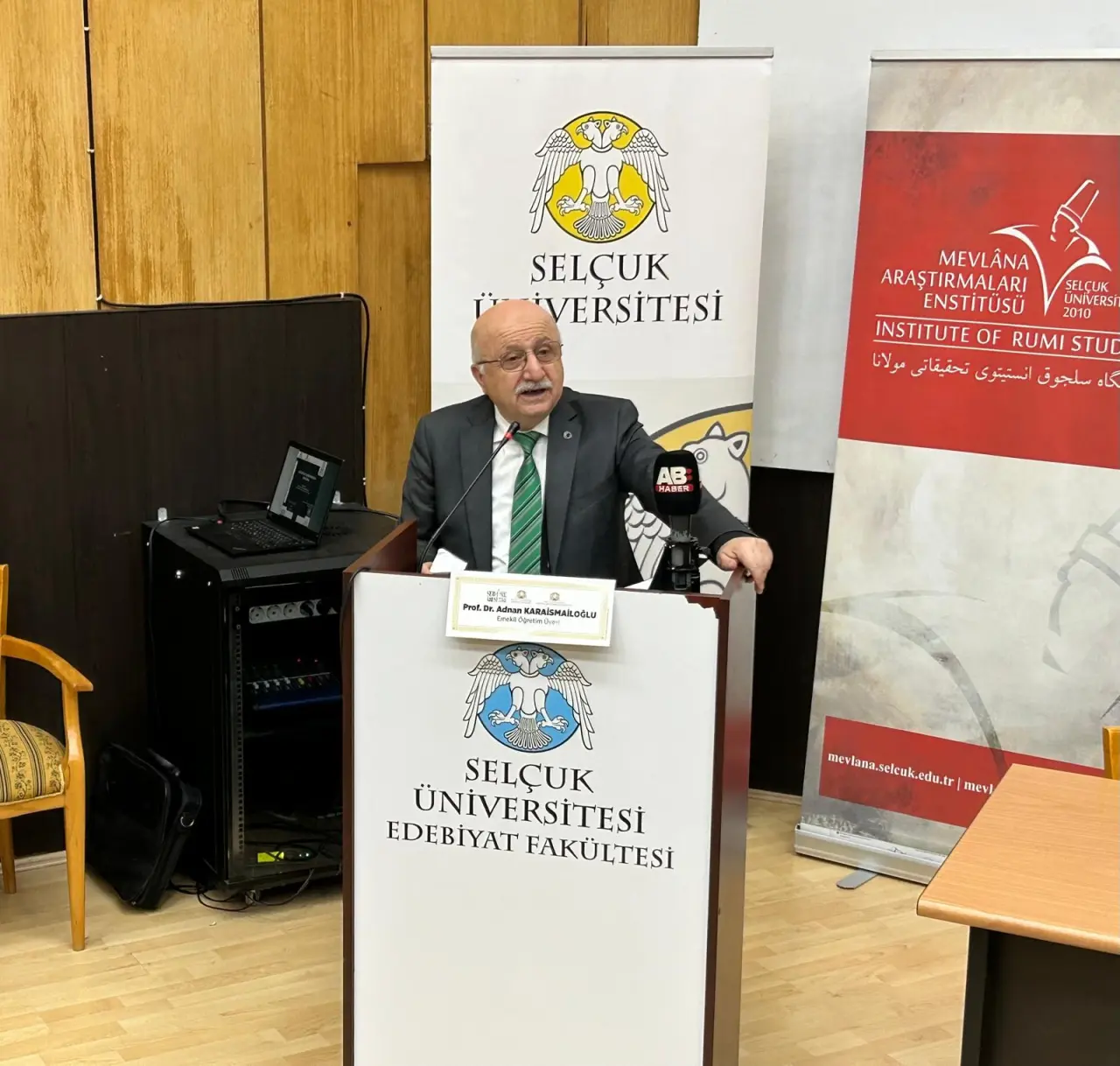 Selçuk Üniversitesi Mevlana Araştırmaları Enstitüsü ile Edebiyat Fakültesi iş birliğinde gerçekleştirilen konferansta, Prof. Dr. Adnan Karaismailoğlu Hz. Mevlana’nın gönül dünyası, edebi mirası ve çağlara aktarılan evrensel iletisini konuştu.