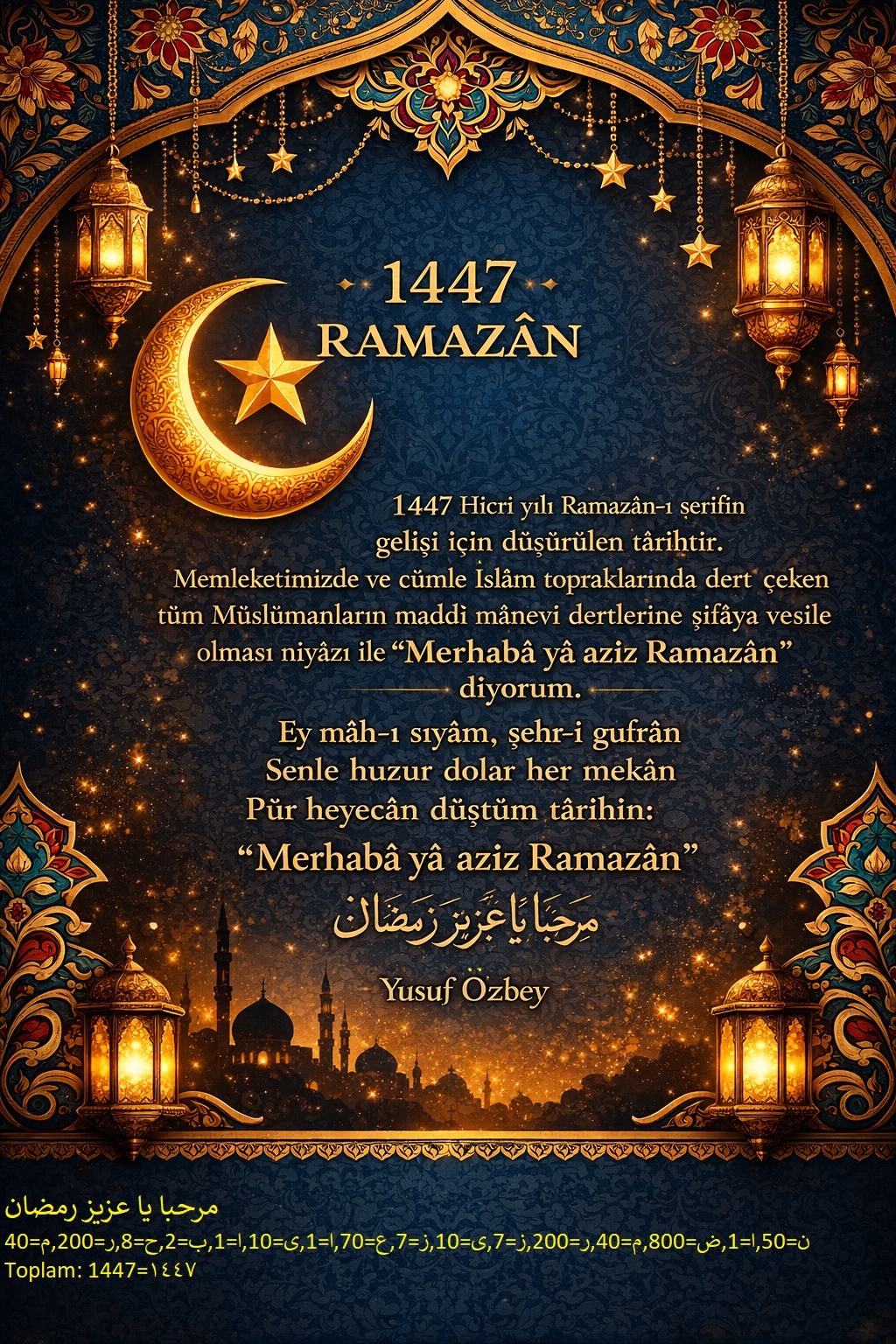 Hicri 1447 yılı Ramazân-ı şerîfin gelişi için düşürülen târîhtir. Memleketimizde ve cümle İslâm topraklarında dert çeken tüm Müslümanların maddi manevî dertlerine şifâya vesile olması niyâzı ile “Merhabâ yâ azîz Ramazân” diyorum.