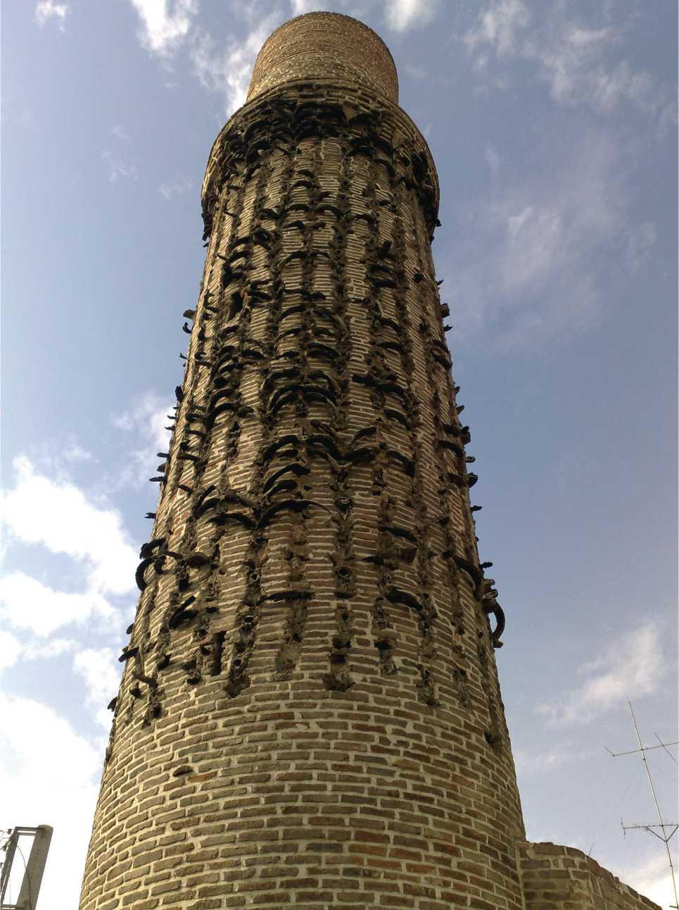 Şems-i Tebrizi’ye ait olduğu söylenen mezarın hemen yanında bulunan XV. yüzyıla ait koç boynuzlu minare (İran-Hoy)