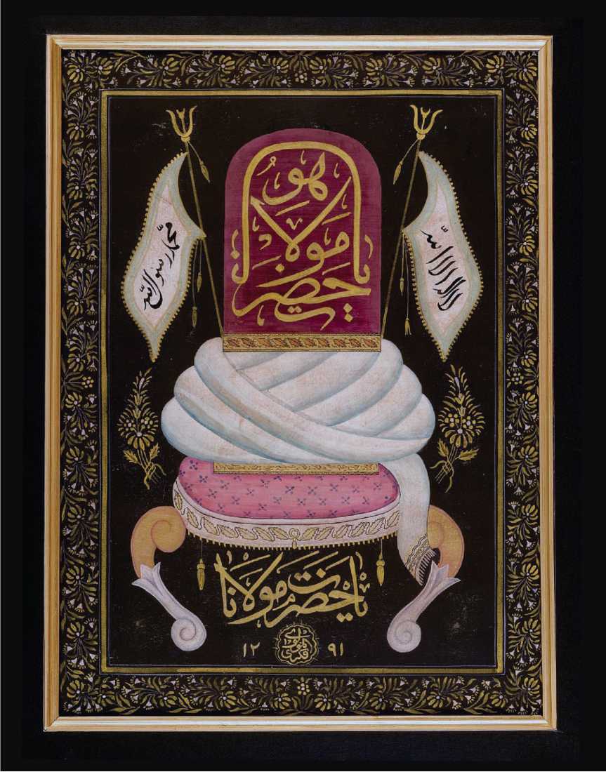 Mevlevî Sikkesi şeklinde istiflenmiş Yâ Hazret-i Mevlânâ yazılı tekke levhası. Hat: Fikrî el- Mevlevî, tarih: 1291
