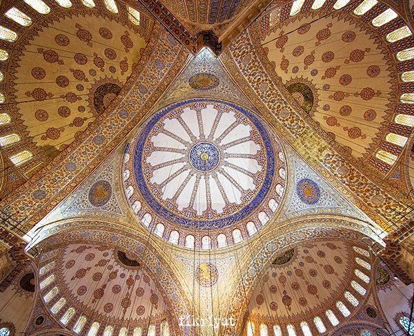 Camiler dış avlu, iç avlu ve harimin olduğu üstü kubbe ile örtülü ana yapıdan oluşur. Ana yapının yani namaz kılınan iç mekân kare veya kareye yakın planlıdır. Dört köşesinde dört minare olan tek cami de Sultanahmet’tir. Üstelik bu dört minare üç şerefelidir. Bu beyitte Sultanahmet’in dört minaresi kulağa, üç şerefe de kulağa takılmış üç halkalı küpeye benzetilmiştir.