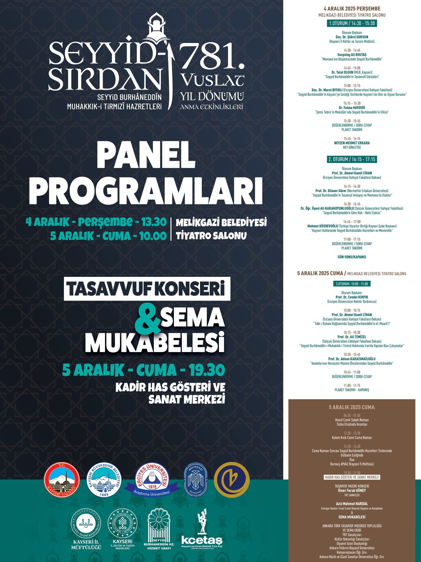 Hazret’in ilmi, irfanı ve Anadolu’nun manevi birliğini tesis etmedeki rolünü akademik bir ciddiyetle ele almak ve bu mirası, özellikle genç nesillere aktarmaktır. Bu hedefler doğrultusunda düzenlediğimiz iki günlük etkinlik takvimi şöyledir: 4 – 5 Aralık 2025 Melikgazi Belediyesi Tiyatro Salonu; programın ilk bölümü, 12 değerli panelist ve oturum başkanlarının katılımıyla üç oturum halinde düzenlenecek panellerden oluşmaktadır. Ülkemizin saygın üniversitelerinden öğretim üyeleri, araştırmacılar, yazarlar, kültür, eğitim ve din alanında görev yapan il müdürleri ve kanaat önderleri sunumlar yapacak ve söyleşiler gerçekleştirecektir.