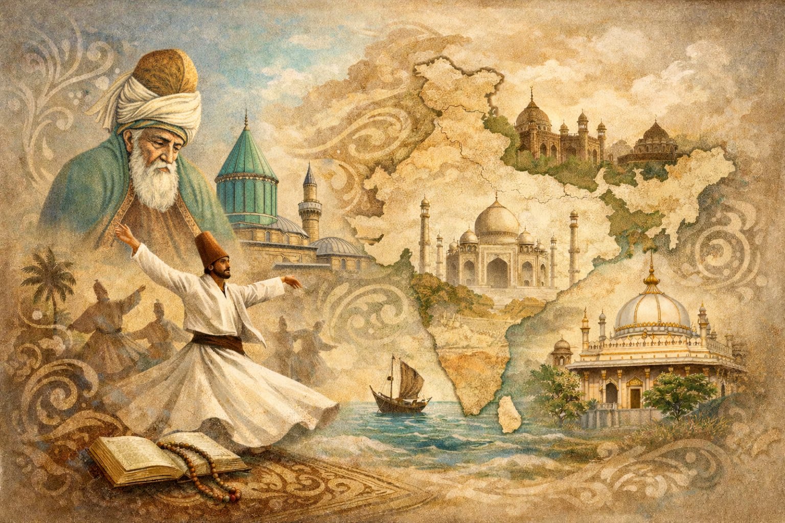 Diğer yandan Hint Alt Kıtası’nda tasavvuf, güçlü bir damara sahip ve günlük hayatla çok iç içe geçmiş durumda. Ajmer’de Muînüddîn Çiştî, Delhi’de Nizâmeddin Evliya, Şehvan’da Lal Şahbaz Kalender, Dakka ve çevresindeki pek çok tekke ve türbe, “veli coğrafyası” şeklinde birbirine bağlanıyor. Türbe ziyaretleri, zikir halkaları, şiir meclisleri ve kavvali geleneği, bu bölgede İslam’ın duygusal ve estetik yüzünü taşıyan ana kanallar. Mevlâna, bu ağın içinde hem klasik bir âlim hem de daha geniş bir insani ufka işaret eden bilge figür olarak saygı görüyor.