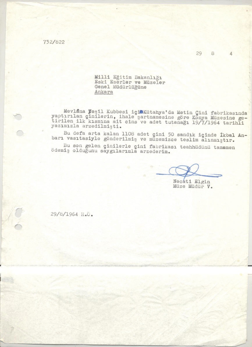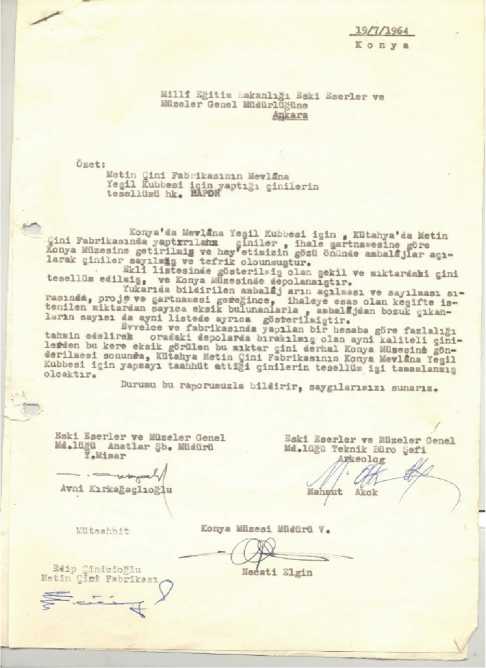 G. 2: Metin Çini Fabrikasının Mevlânâ Yeşil Kubbesi için yaptığı çinilerin tesellüm raporu (Konya Müze Müdürlüğü, 1964 yılı tamirat dosyası, belge no:012)