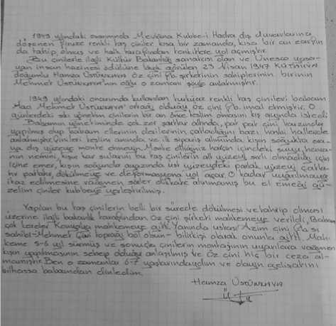 G. 4: Hamza Üstünkaya’nın 1949 yılındaki onarım sonrasında gelişen hadiselere dair görüşleri (Gülseren Üstünkaya Öztuğcu, 2020)