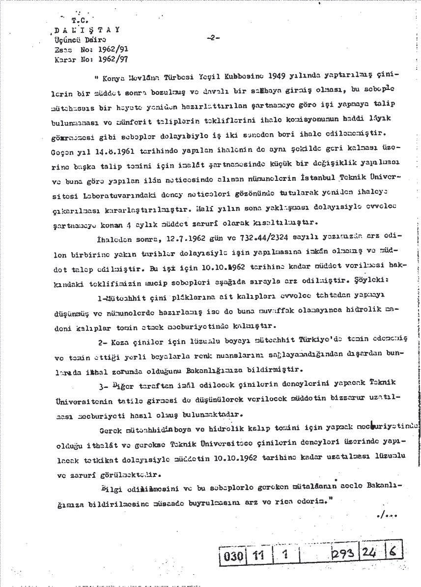 Bu belgeden normalde 15.02.1962’de sona eren çini teslim tarihinin mücbir sebeplerle 10.10.1962’ye kadar uzatıldığı yani çini üretimi için ilaveten 8 ay gibi bir sürenin tanındığı anlaşılmaktadır. Fakat üstlenici firma tanınan ek sürede de gerekli eksikleri yerine getirememiş ve 1963’te iflas etmiştir. G. 9’da Taylan Seramik Fabrikası’nın 2. konkordato ilanı görülmektedir. Konuyla ilgili olarak Sanat Art dergisinden Şerife Deniz Ulueren, Taylan Seramik Fabrikasının kurucularından Tarık Taylan ve eşi Se- niye Fenmen’in kızı seramik sanatçısı Ferhan Taylan Erder ile yaptığı röportajında dönemin önemli fabrikalarından olan Taylan Seramik’in kapanma sebebini sormuştur. Soruya cevaben Ferhan Taylan Erder: