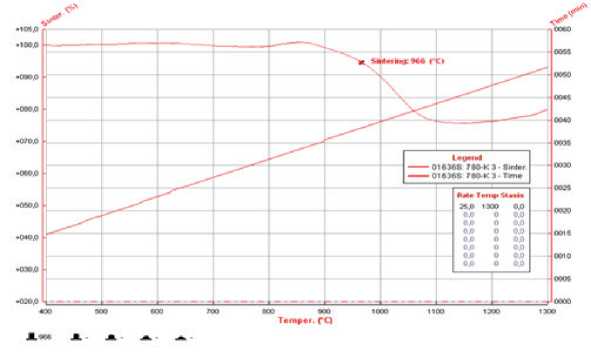 c) Konya Müze Müdürlüğünden temin edilen 1965 onarımına ait çini örneğinin termal özellikleri ısı mikroskopu analizi yapılarak belirlenmiştir. Analiz Ege Seramik fabrikasında, Misura HSM 3M (İtalya) marka ısı mikroskobu cihazında 50°C/dk hızla 1300°C’ye ısıtma koşullarında gerçekleştirilmiştir. Analiz sonucunda çininin pişme (sinterleme) noktasının 966 oC olduğu tespit edilmiştir (G. 11).