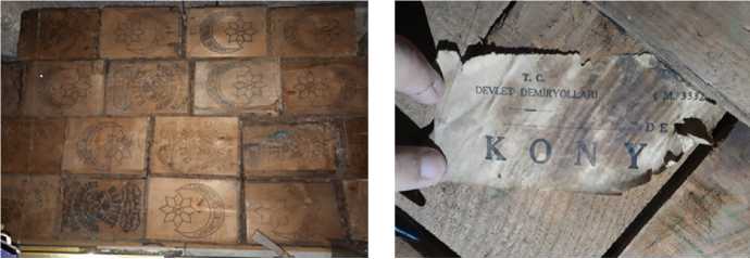 show that those tiles were entirely distinctive from the Kütahya tiles in terms of form and glaze compositions, and that metal hydraulic molds were used to shape the tiles, which were dried in electric furnaces at higher temperatures. The color of the tile was not peculiar to Kütahya tiles. The Taylan Ceramic Factory used to manufacture ce- ramics in Istanbul and Samsun, had modern electric furnaces and other technological facilities, had strong commercial links with Germany and Italy, and imported colored glazes. According to the records of the Konya Museum Directorate, the tiles were transferred from Kütahya to Konya in wooden boxes. After a careful examination of the tile boxes in the warehouse, it was found that the boxes were of foreign origin with customs stamps on them. However, we could not find any information about the content of those imported boxes in Kütahya.