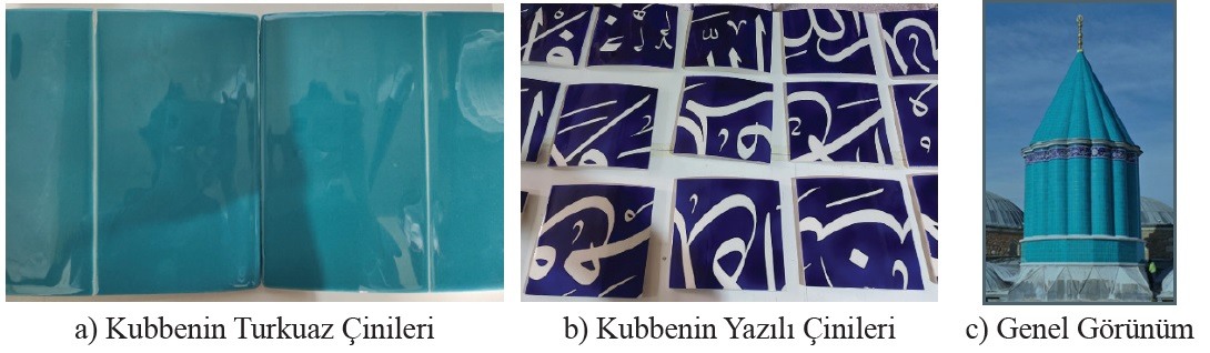 As seen in the literature, the tiles of the dome, also known as Kubbe-i Hadrâ, were renewed in 1677, 1698, 1791, 1797, 1816, 1835, 1866, 1909, 1949, and 1965. Accord- ing to the 17th-century records, the tiles used in the restoration in 1698 were produced by applying the underglaze technique in Iznik. Since 1816, Kütahya tiles have been preferred for the restorations in the Mevlânâ tomb. However, historical records prove that the durability of those Kütahya tiles was poor.