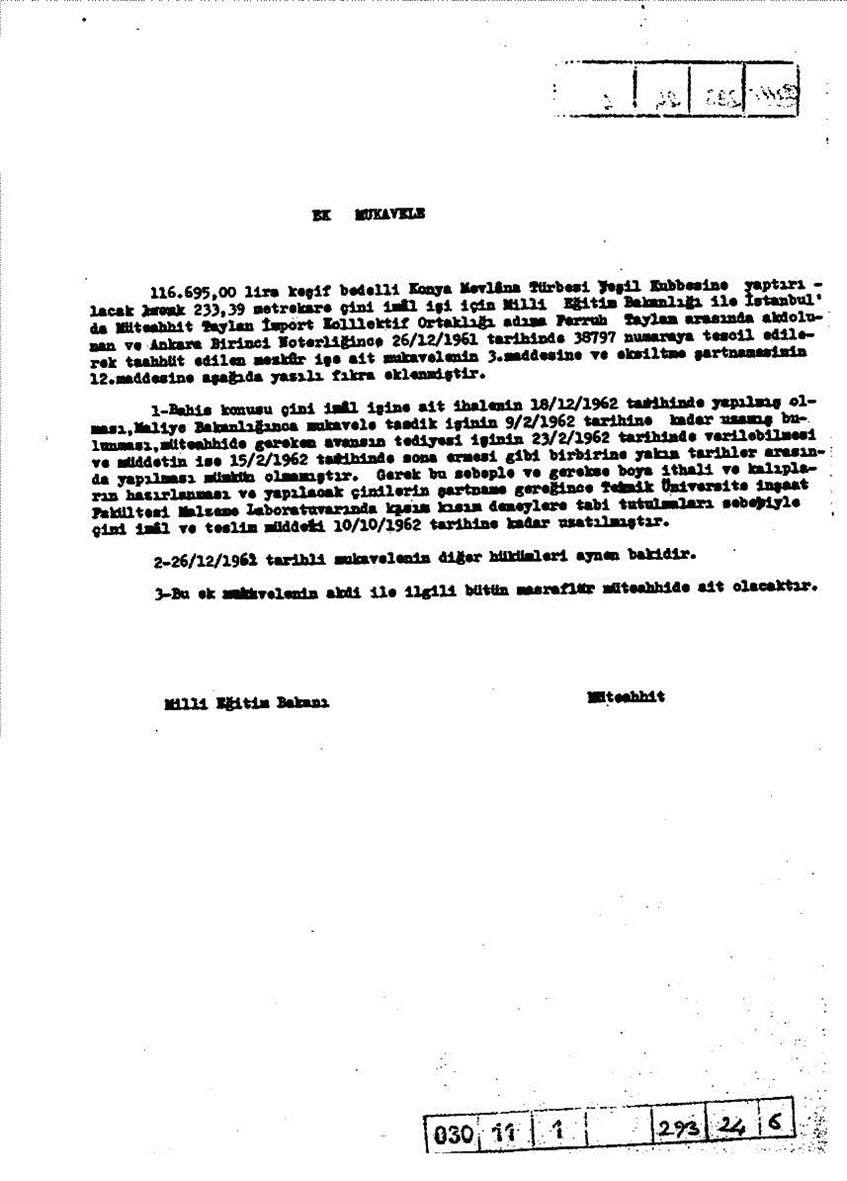Kubbe çinilerinin yenilenmesi Konya basınında da ciddi anlamda yer bulmuştur. Yeni Konya gazetesinde 27 Kasım 1961 yılında çıkan haberde Milli Eğitim Bakanlığınca Konya Yeşil Türbe çinilerinin yenilenmesi için kısa süre içerisinde bir ihalenin gerçekleştirileceği 1. sayfadan verilmiştir . Bu haberden üç hafta sonra yani 18.12.1961 tarihinde yapılan eksiltme sonunda Mevlânâ Türbesi kubbesine ait, 233,39 metrekare ve 116695,00 keşif bedelli, çini imali işi 16.337,30 lira tenzilat ile İstanbul’da bulunan Taylan İmport Kollektif Ortaklığına (Taylan Seramik Fabrikası) ihale edilmiştir (G. 8).