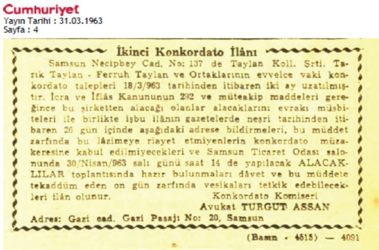 Taylan Koll Şrti. “İkinci Konkordato İlânı.” Cumhuriyet. 31.03.1963, 4.